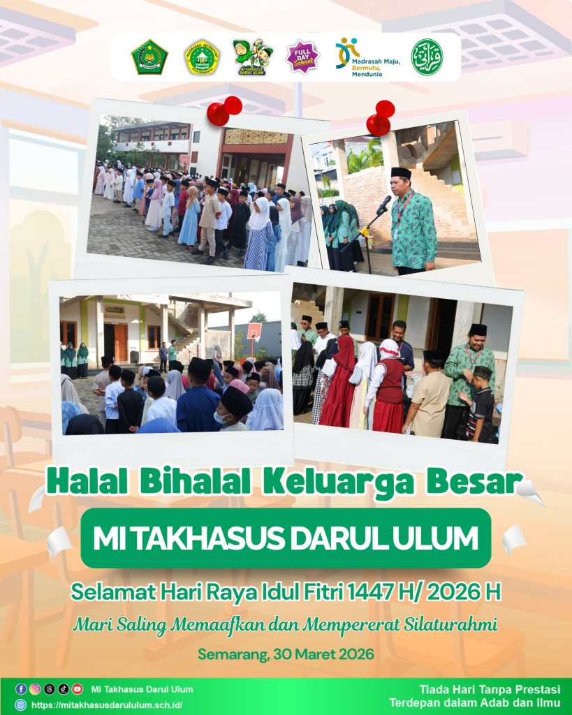 Kegiatan Halal Bihalal Keluarga Besar MI Takhasus Darul Ulum dilaksanakan pada Senin, 30 Maret 2026, di lingkungan madrasah. Acara ini diikuti oleh seluruh siswa, guru, dan tenaga kependidikan dengan penuh khidmat dan kebersamaan. Kegiatan ini menjadi momen penting setelah Hari Raya Idul Fitri untuk saling bermaafan dan mempererat hubungan antarwarga madrasah.